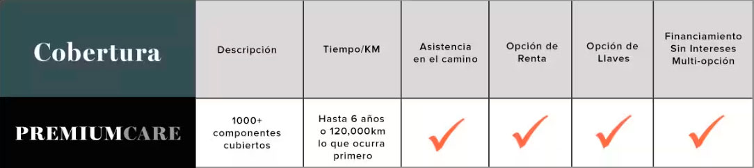 El plan PremiumCARE fue pensado para brindarte la mayor seguridad, por lo que su cobertura ofrece protección en más de 1,000 componentes, algunos de los más relevantes son motor, transmisión, suspensión, frenos, eje de tracción delantero y trasero, aire acondicionado y calefacción, sistema eléctrico y mucho más.